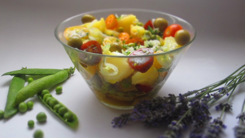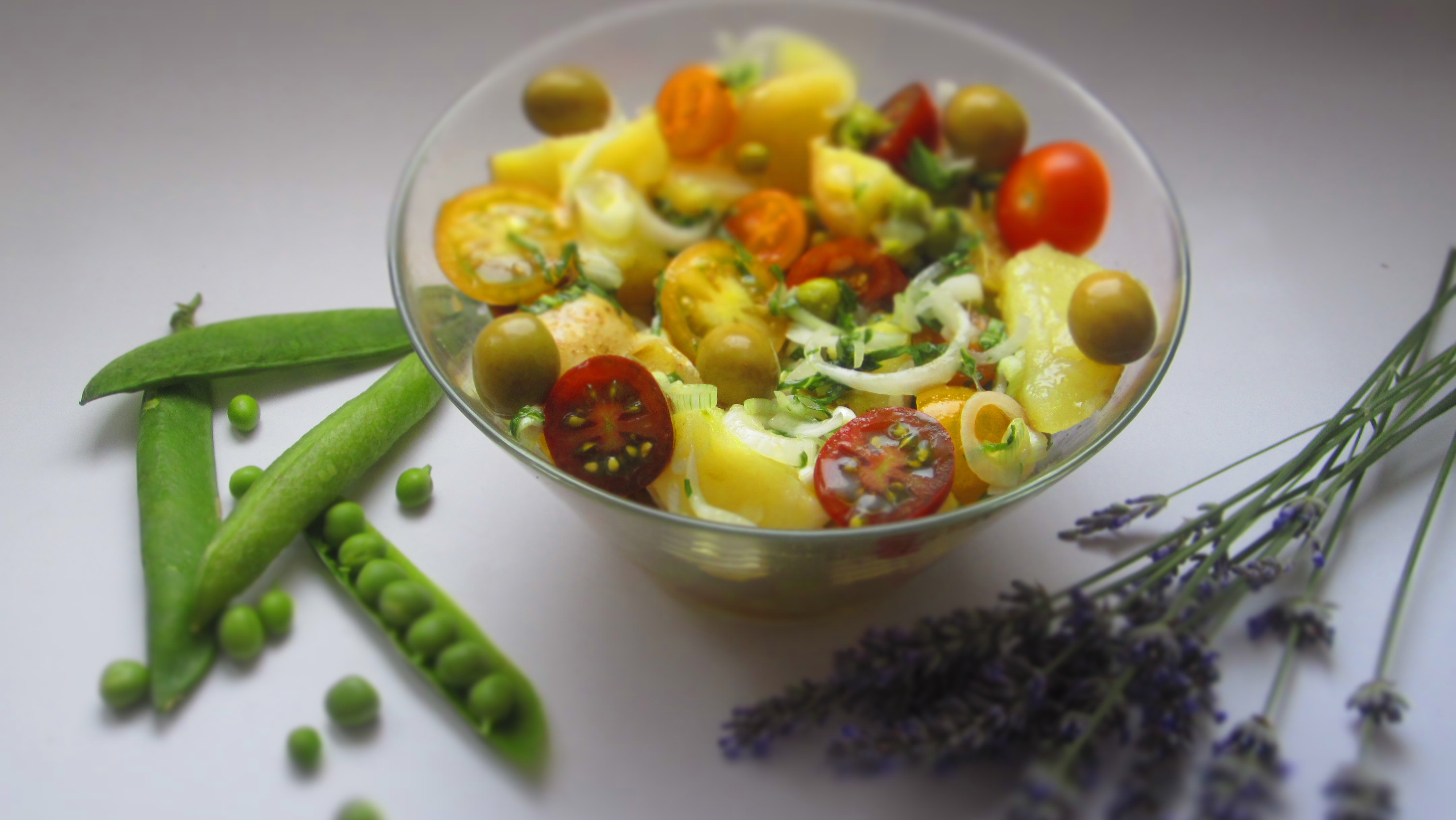 En una ensaladera colocamos nuestras patatas ya templadas, los guisantes bien escurridos, los tomates y regamos con la vinagreta de albahaca, por últimos agregamos unas pocas aceitunas.